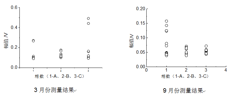 四川某220kV GIS站:在2017年3月份的检测中某断路器间隔振动信号幅值较高,经过分析认为是外部紧固松动导致的振动信号。到9月份进行了处理,将外部所有紧固螺栓进行了进一步的加固,复测信号如右图所示,信号幅值已经下降到合理水平。