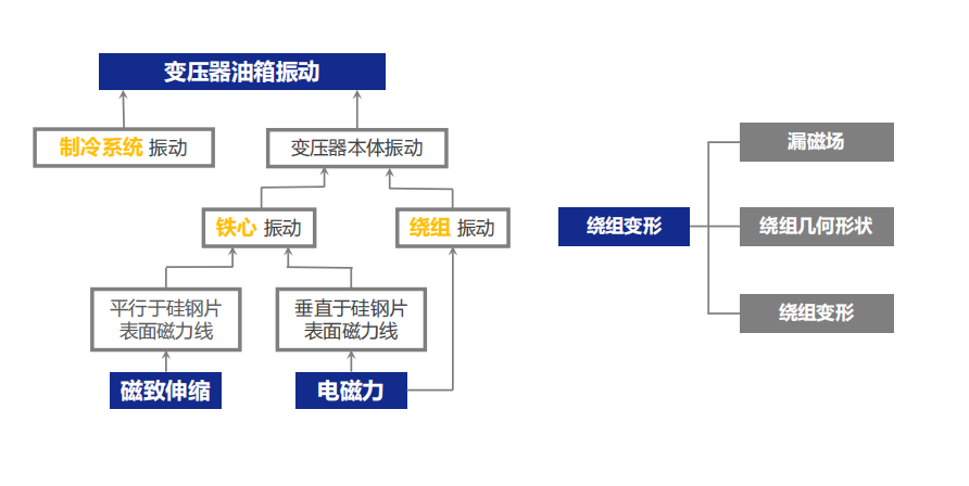 振动产生振动波通过固体连接和变压器油传递至箱体表面,引起油箱壁的振动,变压器油箱本身可近似认为是线性结构,而且其低阶模态的自然频率远低于绕组和铁芯振动的频率,不会改变由绕组和铁芯传递到油箱的振动特性,故油箱表面上的绕组振动100Hz成份理论上与负载电流平方成正比。发生变形的变压器绕组会引起漏磁场、几何形状、固有的模态频率变化,使得传递至邮箱表面的振动信号发生改变,为通过振动信号检测绕组变形提供依据。